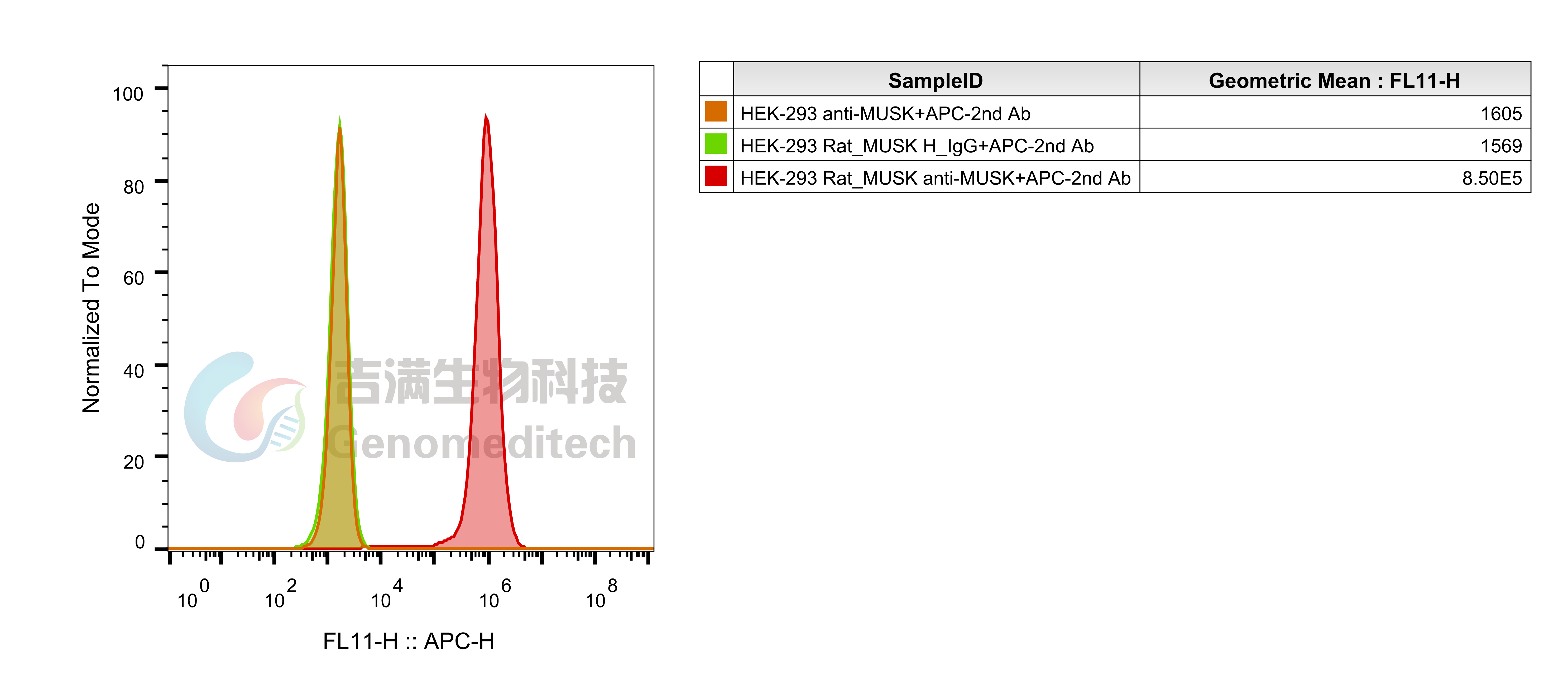 Rat_MUSK HEK-293 Cell Line (Cat. GM-C37520) was determined by flow cytometry using Anti-MUSK hIgG1 Antibody(3B2g2m1) (Cat. GM-87838AB).