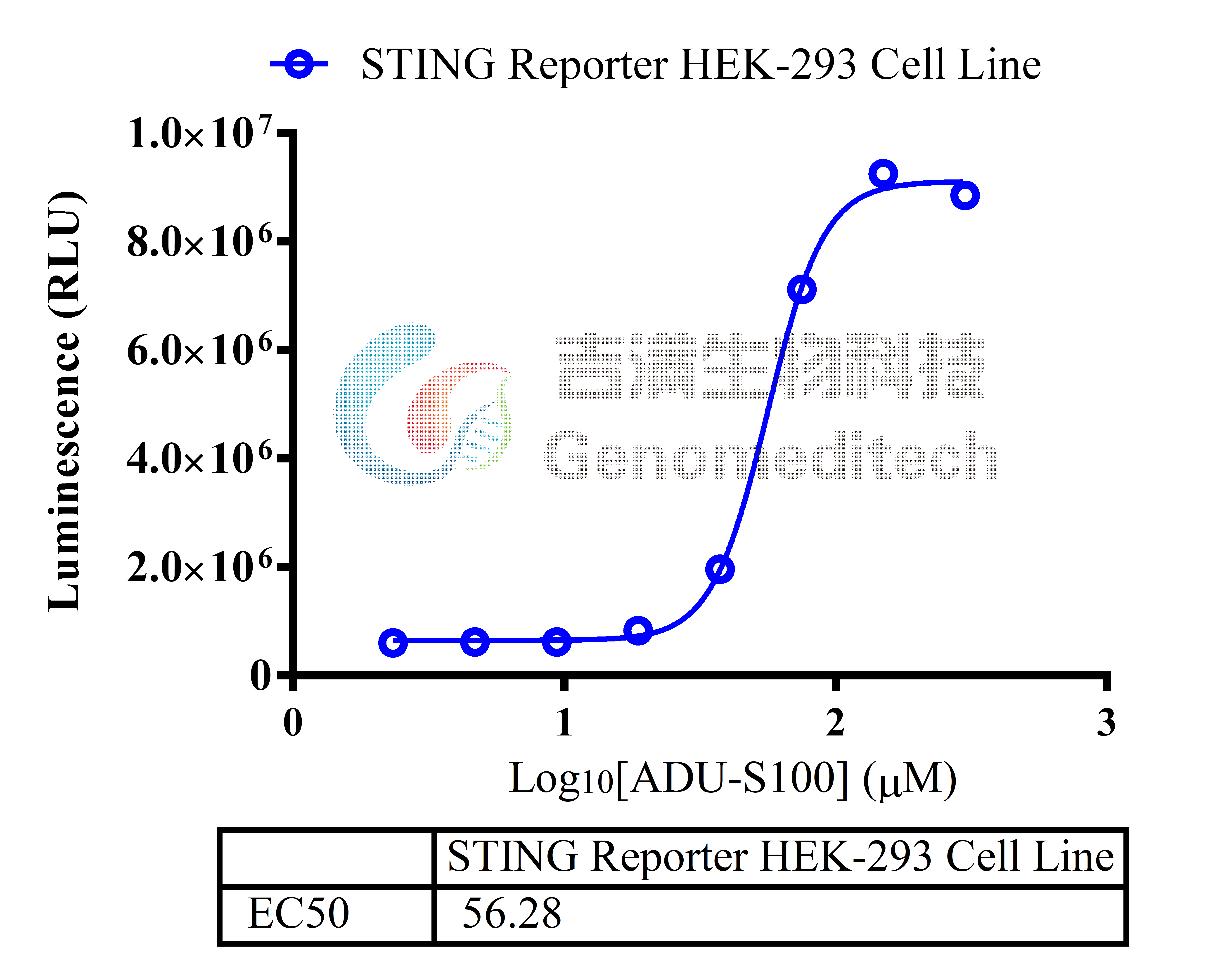 Response to ADU-S100 disodium salt. The STING Reporter HEK-293 Cell Line (Cat. GM-C33256) at a concentration of 1.5E4 cells/well (96-well format) was stimulated with serial dilutions of ADU-S100 disodium salt (MCE/HY-12885A) in assay buffer (DMEM + 1% FBS + 1% P.S) for 16 hours. The firefly luciferase activity was measured using the Luciferase Reporter Assay Kit (Genomeditech). The maximum induction fold was approximately [15.2]. Data are shown by drug molar concentration.