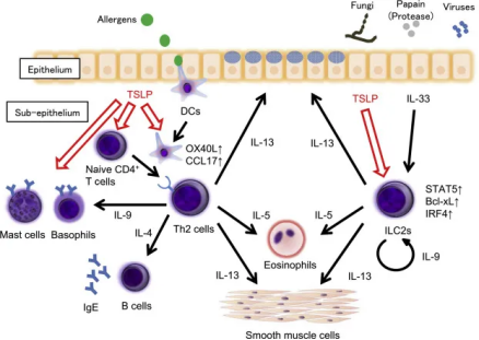 Overall, the TSLP-TSLPR axis and its downstream signaling molecules play a critical role in the development and progression of allergic inflammatory diseases, such as allergic asthma.