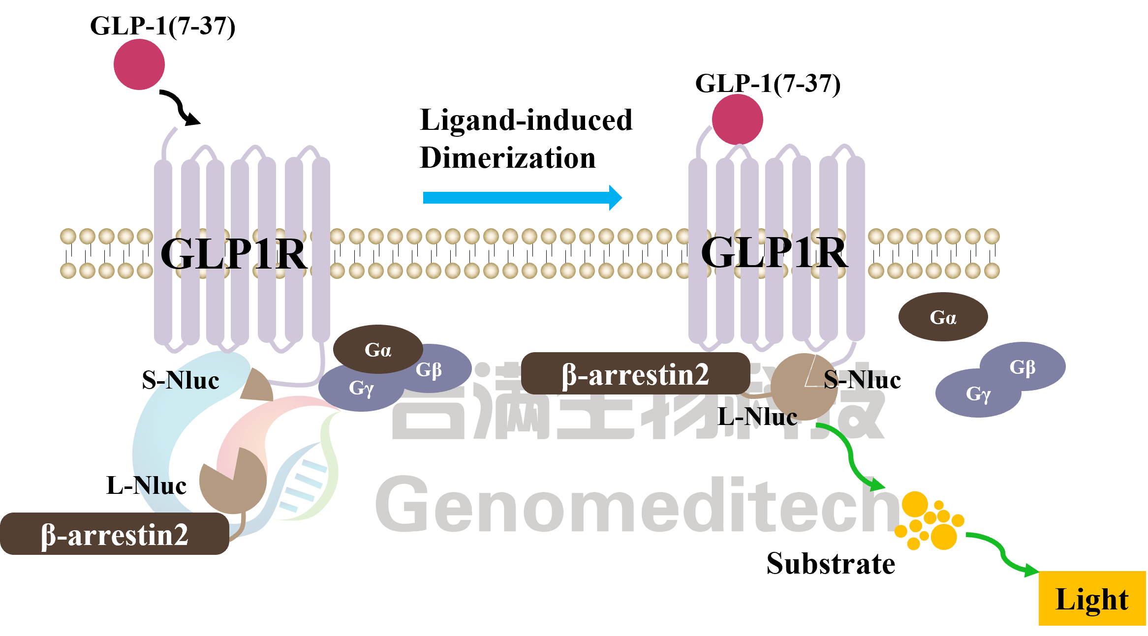 | Cat. No: GM-C38752 Product: H_GLP1R β-Arrestin Reporter CHO-K1 Cell Line The GLP-1 receptor (GLP-1R) is a G protein-coupled receptor encoded by the GLP1R gene on chromosome 6. It is expressed in pancreatic cells and brain neurons, playing a key role in insulin synthesis, secretion, and appetite regulation. GLP-1R activation increases intracellular cAMP levels via the adenylyl cyclase (AC) pathway, activating protein kinase A (PKA). This makes GLP-1R a critical target for diabetes drugs (GLP-1R agonists). Upon agonist activation, GPCRs are phosphorylated by GRKs, exposing β-arrestin binding sites. β-arrestin binds to the receptor and cell membrane, where it stabilizes and facilitates receptor trafficking to clathrin-coated pits (CCPs) for endocytosis. This process not only desensitizes GPCRs but also activates β-arrestin-mediated, non-G protein signaling pathways. H_GLP1R β-Arrestin Reporter CHO-K1 Cell Line is a clonal stable CHO cell line constructed using lentiviral technology, constitutive expression of the GLP1R receptor gene,and detected using enzyme fragment complementation (EFC) technology. When the agonist binds to the ligand, the two luciferase fragments complement each other to form an active complex. Upon addition of a luciferase substrate, the complex catalyzes the reaction to produce a detectable luminescent signal. This highly sensitive method enables real-time monitoring of receptor interactions as well as functional changes in the cellular environment, making it a powerful tool for drug screening and biological research. | ![]() |